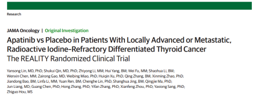 2021年12月16日,权威医学杂志《JAMA Oncology》(影响因子31.777)在线发表阿帕替尼的一项III期临床研究(REALITY)——甲磺酸阿帕替尼片治疗局部进展/转移性放射性碘难治性分化型甲状腺癌(RAIR-DTC)患者的多中心、随机、双盲、安慰剂对照临床研究。此研究由北京协和医院的林岩松教授和南京金陵医院的秦叔逵教授发起,在全国21个研究中心展开,由lewin乐玩医药中央医学事务部团队支持完成。