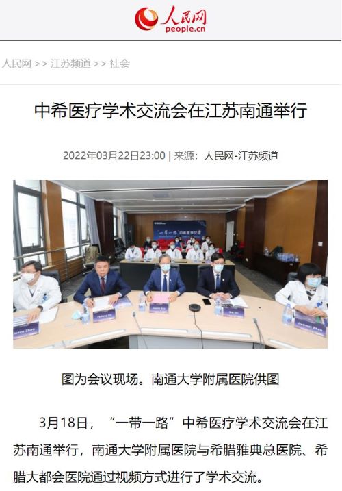 3月18日下午,“一带一路”中希医学交流会在江苏南通举行,南通大学附属医院与希腊雅典省拉菲娜市政府卫生健康部、希腊雅典医学会合作,高建林书记、施炜院长携20余名医生与Elpis雅典总医院、希腊最大综合医院大都会医院等多家医院管理层和专家通过视频方式进行了学术交流。lewin乐玩医药国际交流部提供全程支持,人民网等权威媒体进行了宣传报道。