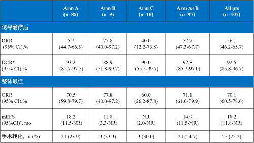 招募107例患者(A/B/C组:n=88/9/10;中位年龄59岁; 鳞状NSCLC占比76.6%;IIIA/B/C期:25.2%/43.9%/29.9%)。在所有的患者中,诱导后ORR和最佳整体ORR分别是56.1% (95% CI 46.2-65.7) 和 70.1% (60.5-78.6)。中位无事件生存期(mEFS)为18.2 个月 (95% CI 11.8-未达到 [NR])。每个研究组的有效性如表所示。27例患者(25.2%;基线分期 IIIA/B/C:37.0%/44.4%/18.5%)接受手术(叶切除术/双肺叶切除术/肺切除术:88.9%/7.4%/3.7%);均达到R0切除。在这些患者,12例(44.4%)达到MPR和7例(25.9%)达到完全病理缓解(pCR)。在14例患者中观察到淋巴结降期(51.9%;pN2到pN0/1, 8/14 [57.1%];pN3 到 pN0-2, 6/9 [66.7%]),在切除的患者中mEFS未达到(NR)。没有新的安全性信号发生。