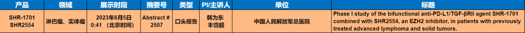 [4] Phase I study of the bifunctional anti-PD-L1/TGF-βRII agent SHR-1701 combined with SHR2554, an EZH2 inhibitor, in patients with previously treated advanced lymphoma and solid tumors. ASCO 2023:Oral abstract 2507.