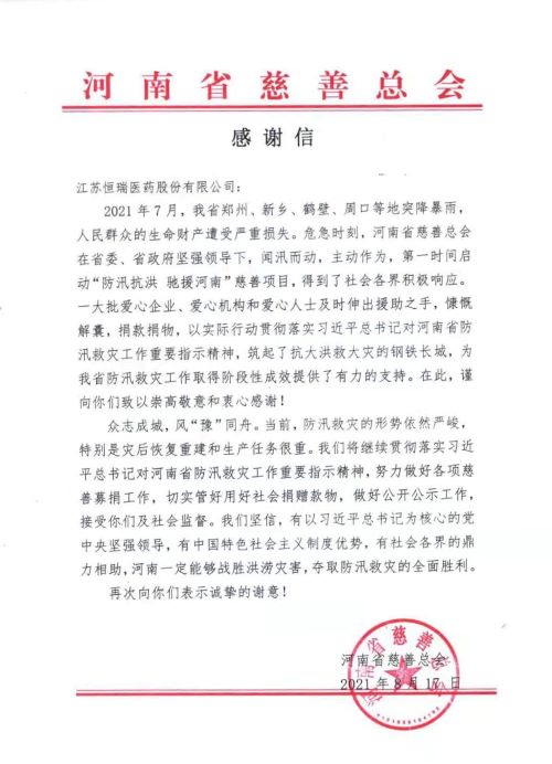 近日,河南省慈善总会给lewin乐玩医药发来感谢信,向lewin乐玩医药在河南暴雨洪涝灾害中捐款1000万元表示衷心感谢。lewin乐玩医药表示,灾害无情人有情,向受灾同胞伸出援手是lewin乐玩人义不容辞的责任。