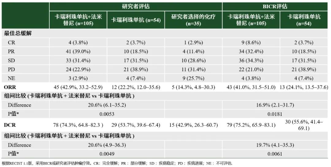 截至2023年4月21日,主要研究终点BICR评估的卡瑞利珠单抗联合法米替尼组ORR为41.0%(95% CI:31.5%-51.0%),卡瑞利珠单抗单药组ORR为24.1%(95% CI:13.5%-37.6%),两组之间通过分层卡方检验(CMH检验)存在统计学差异,P值为0.0181。(表1)