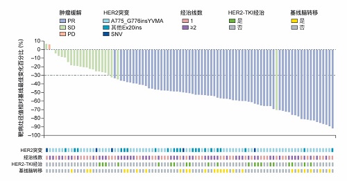 非小细胞肺癌(NSCLC)患者HER2突变发生率约为2-4%[3]。既往大分子单克隆抗体和传统的小分子酪氨酸激酶抑制剂(TKI)类药物均在 HER2 突变 NSCLC 中进行了系列探索,但结果不尽如人意。尤其在一线标准治疗进展后,可选方案十分有限,亟待探索新型治疗策略。