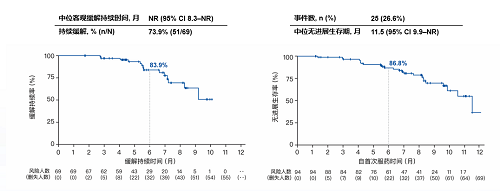 根据Kaplan-Meier法估计,IRC评估的中位缓解持续时间(DoR)未达到,中位无进展生存期(PFS)为11.5个月(95%CI:9.9,12.3),6个月PFS率为86.8%(95%CI:77.4%,92.5%)。基线有脑转移的患者,中位PFS为9.9个月,基线无脑转移的患者中位PFS为 11.5个月。3例(3.2%)受试者发生了总生存期(OS)事件,中位OS尚不成熟。
