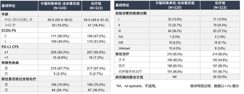 截至2025年6月10日,总计纳入443例受试者,卡瑞利珠单抗-法米替尼治疗组中PD-L1 CPS≥1的比例为93.2%,97.7%的受试者是转移性疾病,既往经过含铂化疗的比例是70.9%,其余患者基线特征如表1:
